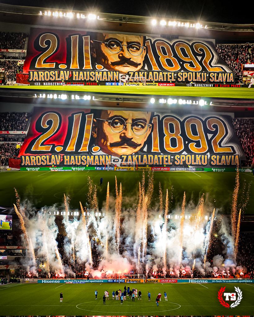 tribunu za brankou pokryla malovaná plachta s tváří Jaroslava Hausmanna – českého